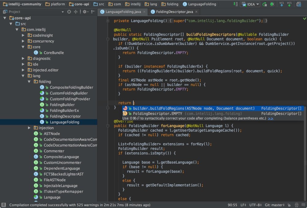 Умное автодополнение, инструменты для анализа качества кода, удобная навигация, расширенные рефакторинги и форматирование для Java, Groovy, Scala, HTML, CSS, JavaScript, CoffeeScript, ActionScript, LESS, XML и многих других языков.
